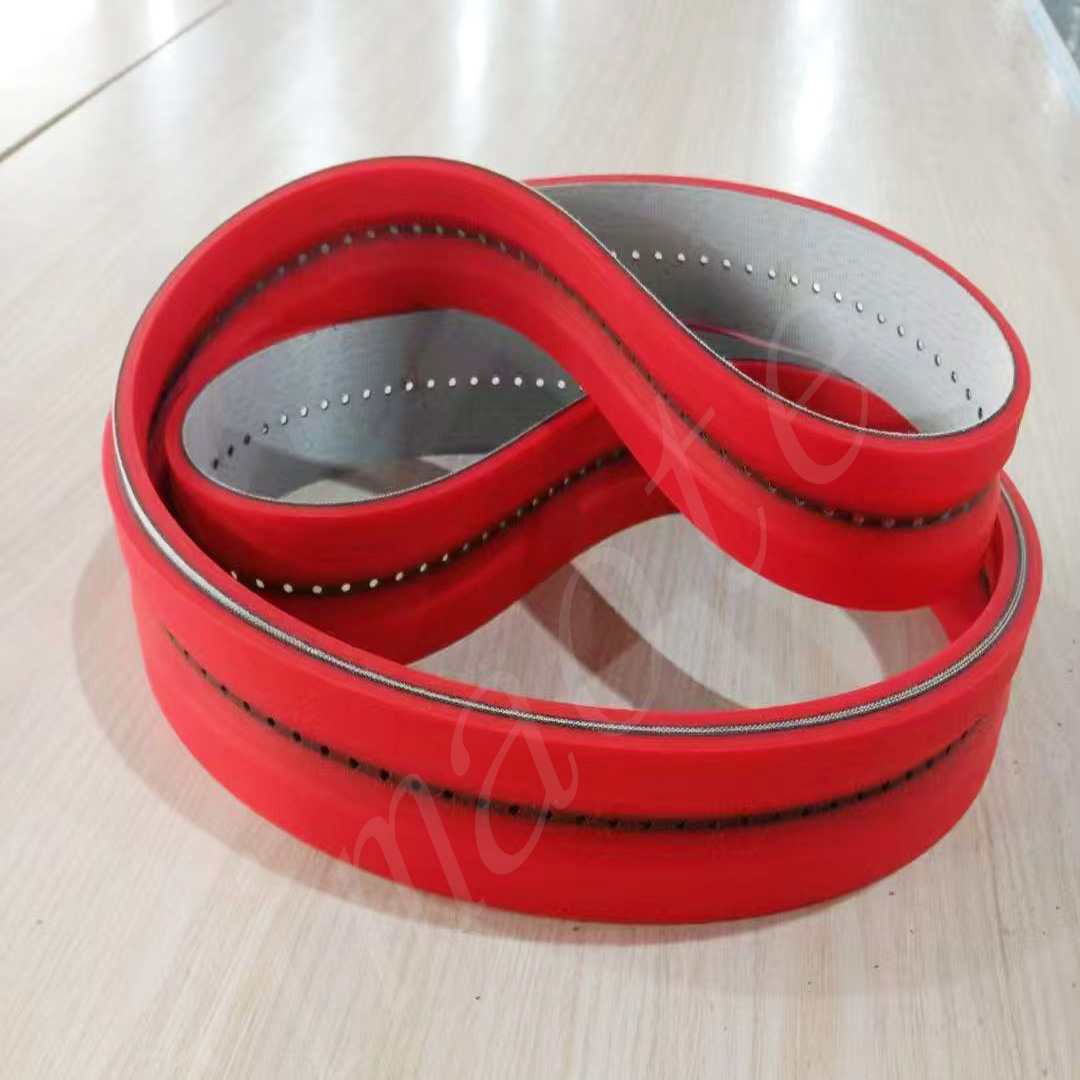 橡膠同步帶傳動是由一根內(nèi)周表面設(shè)有等間距齒形的環(huán)行帶及具有相應(yīng)吻合的輪所組成。它綜合了帶傳動、鏈傳動和齒輪傳動各自的優(yōu)點。轉(zhuǎn)動時,通過帶齒與輪的齒槽相嚙合來傳遞動力。 傳輸龍同步帶傳動具有準(zhǔn)確的傳動比,無滑差,可獲得恒定的速比,傳動平穩(wěn),能吸振,噪音小,傳動比范圍大,一般可達(dá)1:10。允許線速度可達(dá)50M/S,傳遞功率從幾瓦到百千瓦。傳動效率高,一般可達(dá)98%,結(jié)構(gòu)緊湊,適宜于多軸傳動,不需潤滑,無污染,因此可在不允許有污染和工作環(huán)境較為惡劣的場所下正常工作。 傳輸產(chǎn)品廣泛用于紡織、機床、煙草、通訊電纜、輕工、化工、冶金、儀表儀器、食品、礦山、石油、汽車等各行業(yè)各種類型的機械傳動中。橡膠同步帶的特點 		   (1)傳動準(zhǔn)確,工作時無滑動,具有恒定的傳動比;  (2)傳動平穩(wěn),具有緩沖、減振能力,噪聲低;  (3)傳動效率高,可達(dá)0.98,節(jié)能效果明顯;  (4)維護(hù)保養(yǎng)方便,不需潤滑,維護(hù)費用低;  (5)速比范圍大,一般可達(dá)10,線速度可達(dá)50m/s,具有較大的功率傳遞范圍,可達(dá)幾瓦到幾百千瓦;  (6)可用于長距離傳動,中心距可達(dá)10m以上。橡膠同步帶傳動的主要失效形式  ①帶體疲勞斷裂;   ②帶齒剪斷和壓潰;   ③帶側(cè)、帶齒磨損、包布剝離;   ④承載層伸長、節(jié)距增大、形成齒的干涉、爬齒;  ⑤沖擊、過載使帶體斷裂。